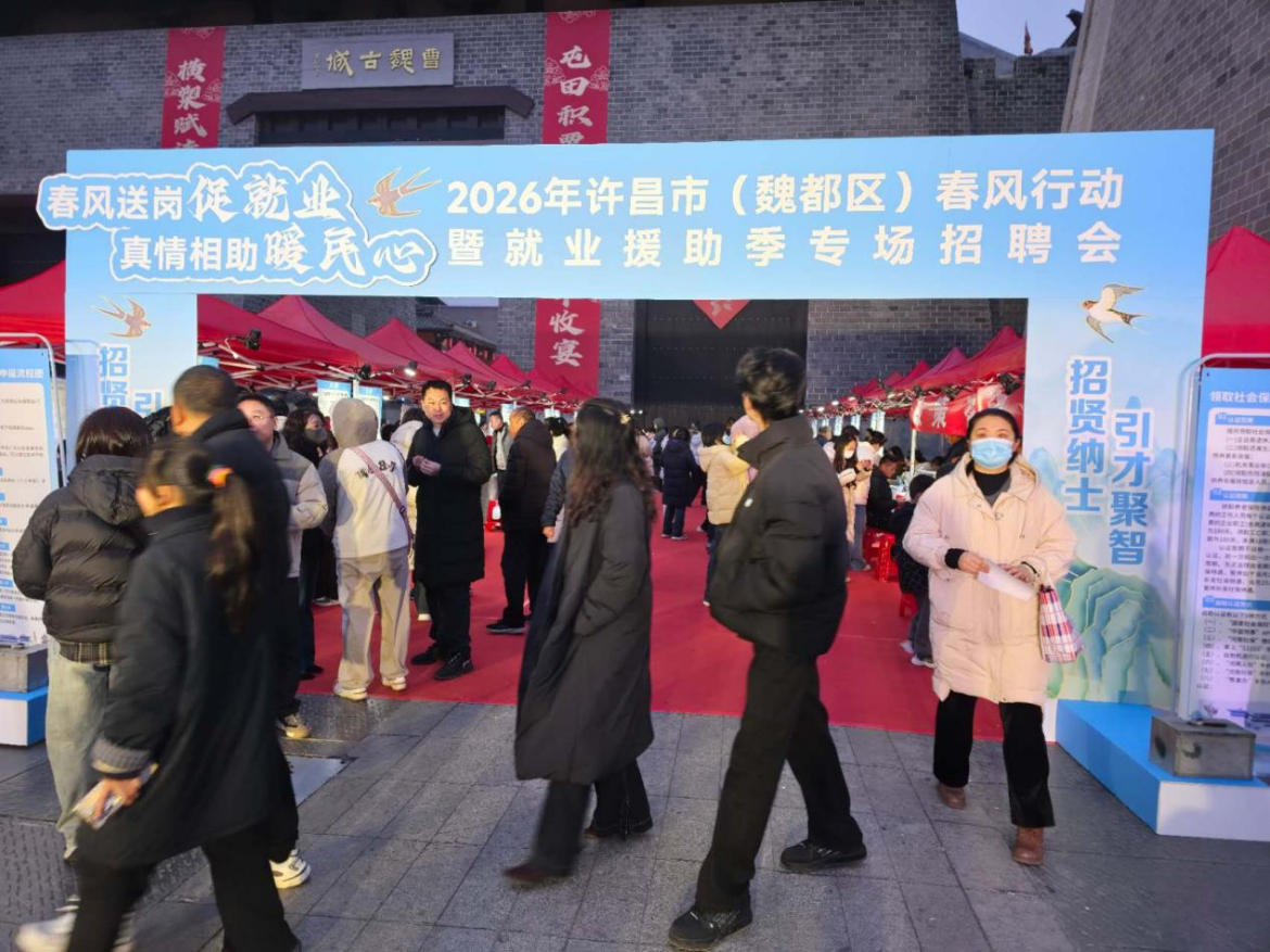 招贤纳士,引才聚智。为贯彻落实省委、市委经济工作会议关于稳就业、稳企业、稳市场、稳预期的决策部署,3月6日晚,由许昌市人社局、魏都区人民政府主办,许昌市就业创业服务中心、魏都区人社局承办的“2026年许昌市(魏都区)春风行动暨就业援助季专场招聘会”,在曹魏古城南城门广场圆满落幕。本次招聘会以“春风送岗促就业 真情相助暖民心”为主题,依托曹魏古城的文化底蕴与人气,为企业和求职者搭建精准对接的平台。魏都区区委书记何长成,许昌市人社局局长冉高垒,魏都区副区长王伟芳,市人社局副局长王博,市就业创业服务中心主任张金国、中心党委书记王留耿出席活动。