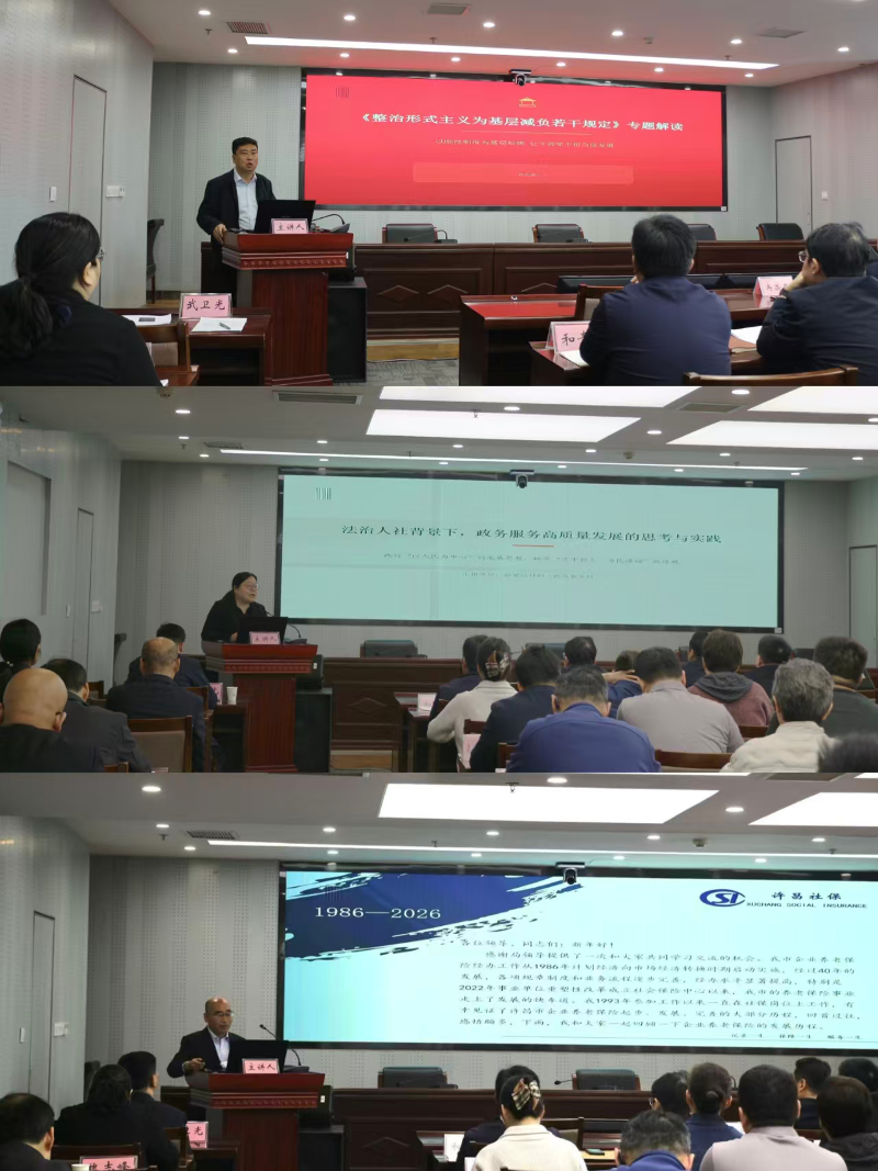 本期三名干部登台讲课,局办公室主任武卫光对《整治形式主义为基层减负若干规定》进行了政策解读,政策法规科科长马聪和大家分享了“法治人社背景下,政务服务高质量发展的思考与实践”,社保中心副主任魏志峰讲述了“我市企业职工基本养老保险经办工作发展历程”。