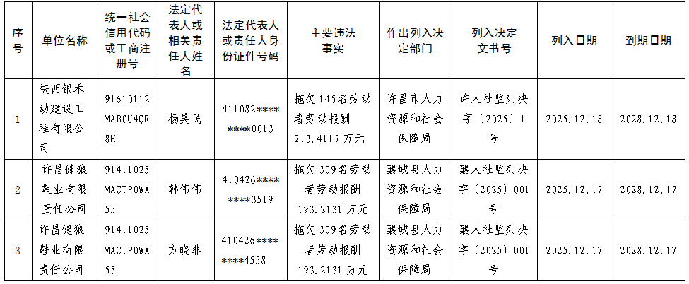 为了维护劳动者合法权益,完善失信约束机制,加强信用监管,强化对拖欠农民工工资违法行为的惩戒,根据《拖欠农民工工资失信联合惩戒对象名单管理暂行办法》(人力资源和社会保障部令第45号),现公布2025年第四批拖欠农民工工资失信联合惩戒对象名单。具体名单如下: