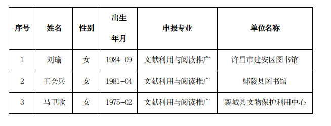 根据我市职称工作安排,通过个人申报、单位推荐、主管部门和许昌市人力资源社会保障部门资格审查、评委会承办部门复核,经河南省文化旅游厅图书资料系列中级职称评审委员会组织专家评审,3名同志通过评审。现将评审通过人员公示如下,请予监督。如对公示人员有问题反映,请在公示期内以书面形式反馈我们。
