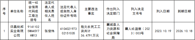 为了维护劳动者合法权益,完善失信约束机制,加强信用监管,强化对拖欠农民工工资违法行为的惩戒,根据《拖欠农民工工资失信联合惩戒对象名单管理暂行办法》(人力资源和社会保障部令第45号),现公布2023年第四批拖欠农民工工资失信联合惩戒对象名单。具体名单如下: