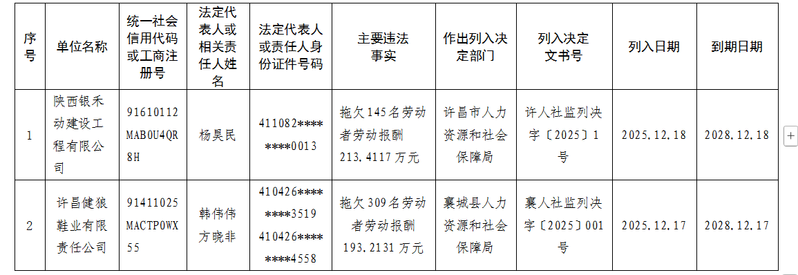 为了维护劳动者合法权益,完善失信约束机制,加强信用监管,强化对拖欠农民工工资违法行为的惩戒,根据《拖欠农民工工资失信联合惩戒对象名单管理暂行办法》(人力资源和社会保障部令第45号),现公布2025年第四批拖欠农民工工资失信联合惩戒对象名单。具体名单如下: