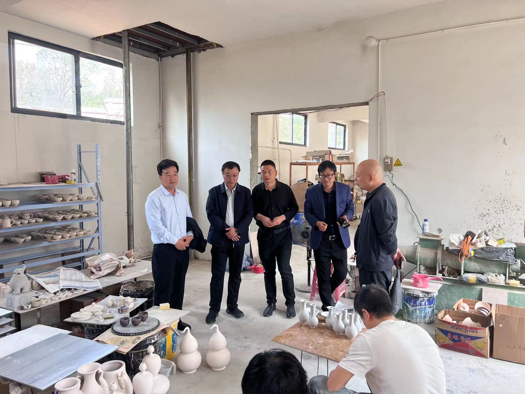 在神垕镇外杜沟村,王博副局长调研了河南省凤阳山瓷业有限公司,该公司负责人李朝斐是该村村民,返乡创业农民工。该公司成立于2016年12月,是一家集设计、制作、生产和销售为一体的现代钧瓷生产企业,产品以传统器型、异型件和茶器为主,主打柴烧钧瓷,造型青翠欲滴,红色饱满,红绿相间,釉色意境自然天成;研发铜系翡翠釉,浑然天成,丰富了窑变系列;坚持诚信为本,传统与时尚相结合,独特的窑变艺术,以其“入窑一色,出窑万彩”的艺术特点广受陶瓷爱好者喜爱,满足人们追求收藏、个性、美观、潮流的需求。该公司现有员工19人,其中省级工艺美术大师1人、专业技术人才5人,脱贫劳动力1人。