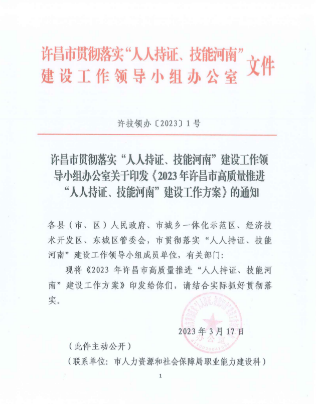 《2023年许昌市高质量推进“人人持证、技能河南”建设工作方案》.pdf
