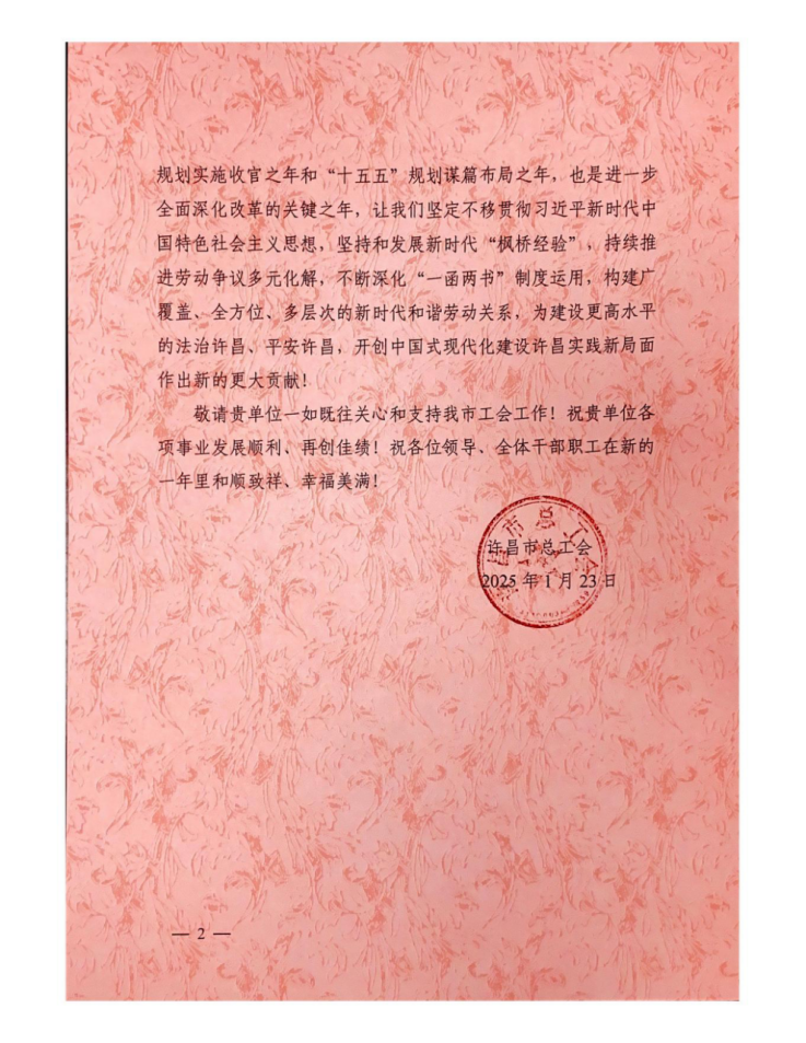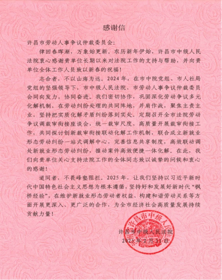 近日,许昌市劳动人事争议仲裁委员会收到来自许昌市中级人民法院、许昌市总工会的感谢信,信中对许昌市劳动争议仲裁委员会在劳动争议调裁审衔接、共建“人社+法院+工会”劳动纠纷一站式调解中心等方面的联动协调、共治解纷工作致以感谢,并对全体工作人员致以诚挚问候。