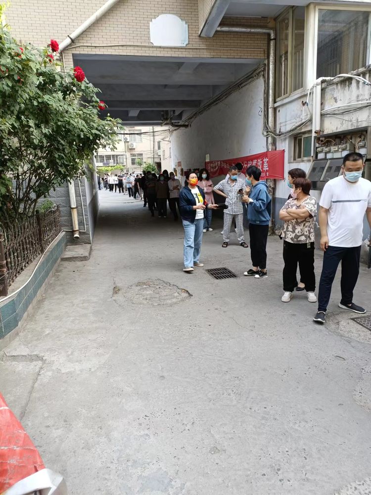 这一天,市人社局党员志愿者周俊杰在小区维护核酸检测秩序,严格执行间距2米要求。