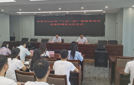 9月17日上午,许昌市举行2022年“三支一扶”高校毕业生赴基层服务出征仪式。新招募的55名“三支一扶”人员在仪式结束后,将通过线上线下相结合的方式接受岗前培训,随后奔赴基层开展为期两年的支教、支农、支医、帮扶乡村振兴等工作,为许昌现代化建设贡献青春力量。