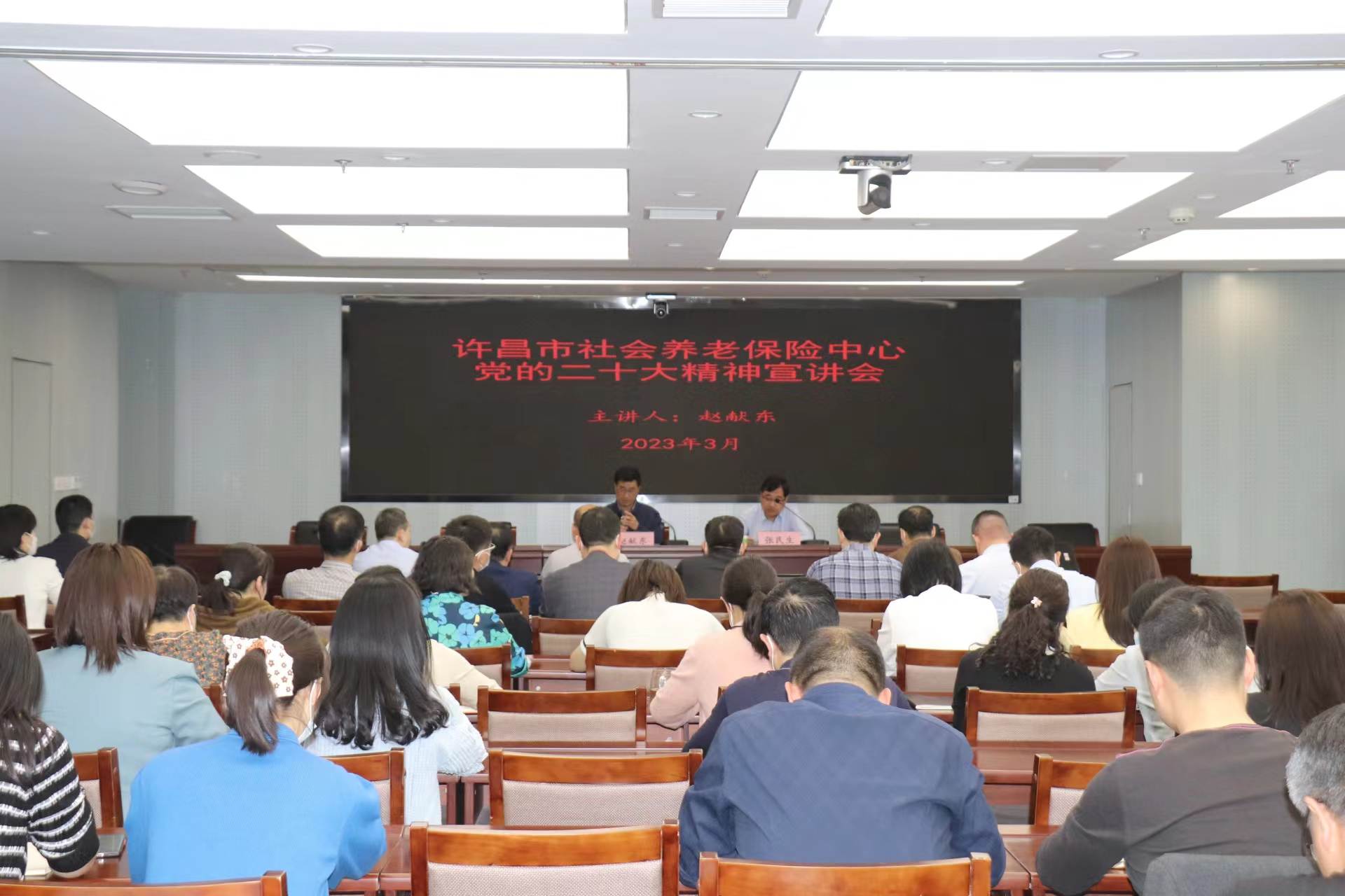 为深入学习贯彻党的二十大精神,2023年3月10日,许昌市社会养老保险中心举办党的二十大精神宣讲会。会议邀请许昌市委二级巡视员、市委宣传部原常务副部长、市委宣讲团成员赵献东作辅导报告,市中心全体干部职工、各县(市、区)企业养老保险中心班子成员参加了会议。