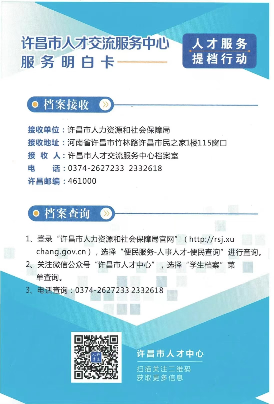 群众的需求,就是我们工作的方向。市人社局人才中心面对群众各种各样的政策咨询和疑问,坚持“从群众中来,到群众中去”,积极开展调查研究工作。在调研中发现,群众的咨询和疑问主要集中在档案邮寄地址、档案去向等方面。针对群众的需求,人才中心倾听民声、收集问题,尊重民意、顺应民心,积极优化便民服务举措,对群众提出的高频问题进行梳理汇总,制作了人才服务“明白卡”,对档案邮寄接收信息、档案查询方式以及许昌各县(市、区)档案存放机构地址进行了全方位的系统解答,既能让广大毕业生及其家长快速了解其档案由学校寄出,经许昌市人社局接转至档案存放地的全过程,又提升了毕业生业务办理效率。