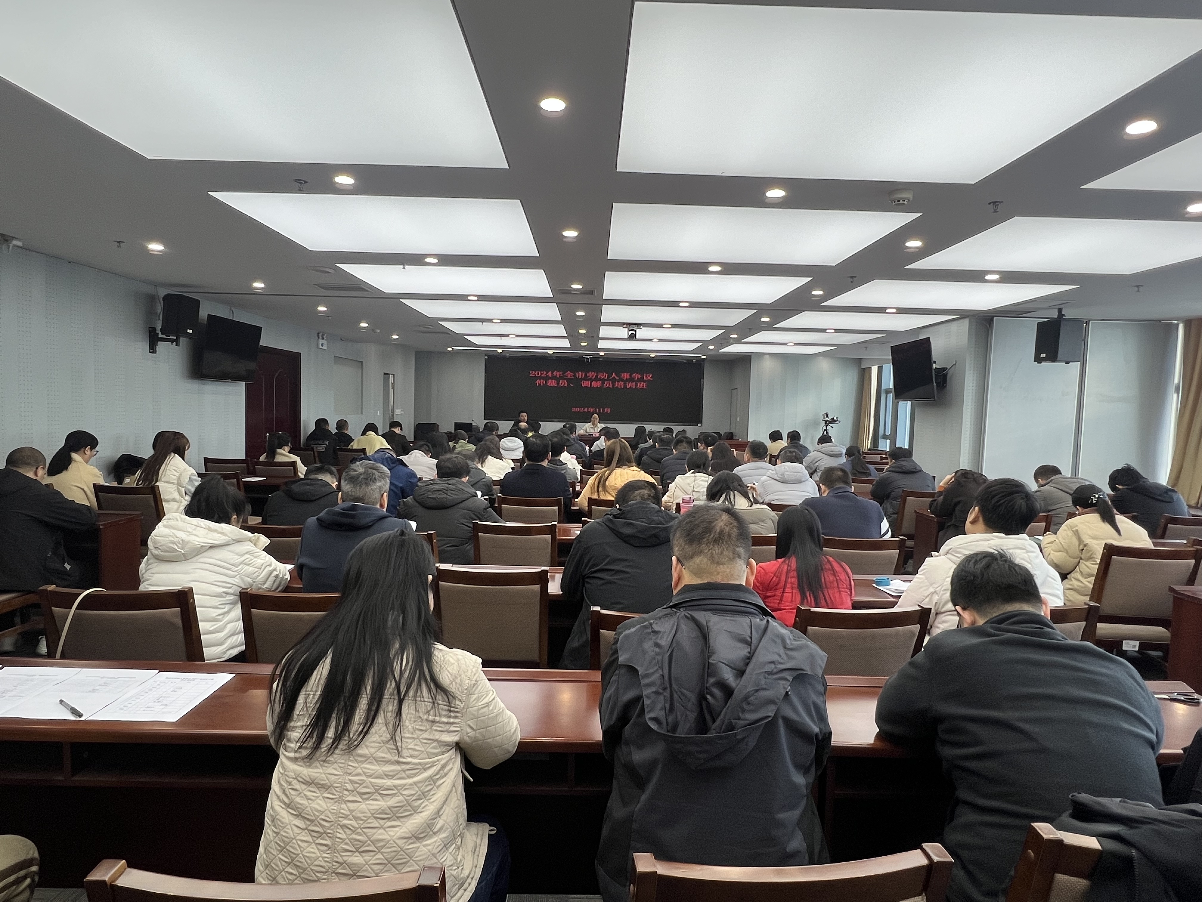 为落实全省劳动人事争议仲裁员培训班会议精神,进一步提升全市劳动人事争议仲裁人员队伍建设,培养和提升仲裁员、调解员专业水平和能力素质,按照《劳动人事争议仲裁调解法》《劳动人事争议仲裁办案规则》《劳动人事争议仲裁组织规则》要求,2024年11月26日-28日,全市人社系统劳动人事争议仲裁部门70余名业务骨干、30名各企业调解组织的调解员参加培训。