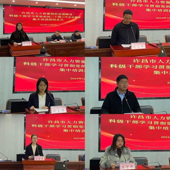 为深入学习贯彻党的二十届三中全会精神,切实把思想和行动统一到以习近平同志为核心的党中央决策部署上来,12月24日至27日,许昌市人力资源和社会保障局举办科级干部学习贯彻党的二十届三中全会精神集中培训班,机关科级以下全体干部职工、局属单位科级领导干部、基层党委(支部)党务干部共100余人参加培训。市人社局党组成员、副局长吴强出席开班仪式并讲话,党组成员、副局长王君出席结业仪式并讲话,三级调研员唐慧杰主持。