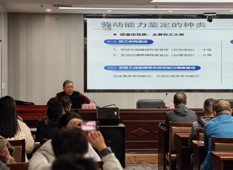 劳动能力鉴定专家张留安主任对《职工工伤与职业病致残等级》和《职工非因工伤残和因病丧失劳动能力程度鉴定标准》进行了培训授课,并重点就鉴定工作中出现的疑难问题进行标准讲解。
