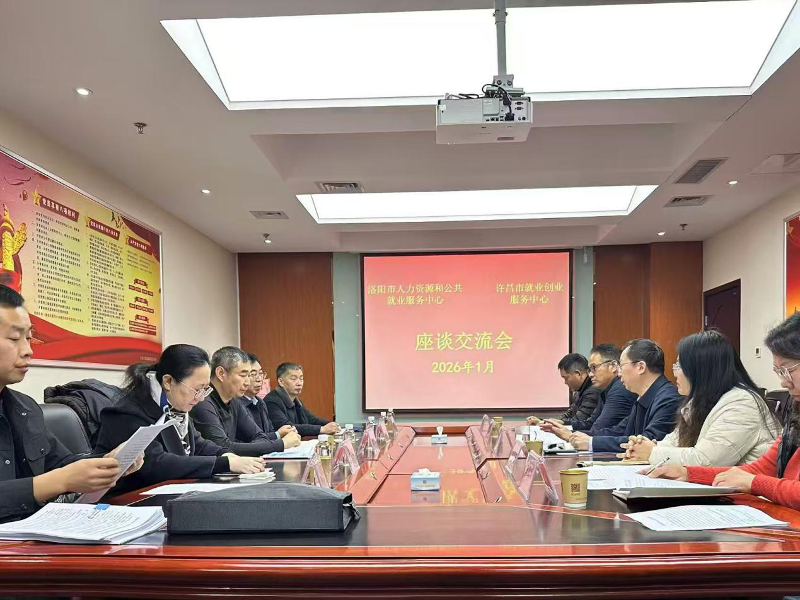 2026年1月15日上午,洛阳市人力资源和公共就业服务中心来许交流就业创业服务工作。市人社局党组成员、副局长王博,市就业创业服务中心主任张金国、党委书记王留耿参加工作交流活动。