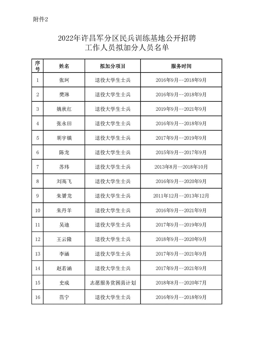 2.2022年许昌军分区民兵训练基地公开招聘工作人员拟加分人员名单