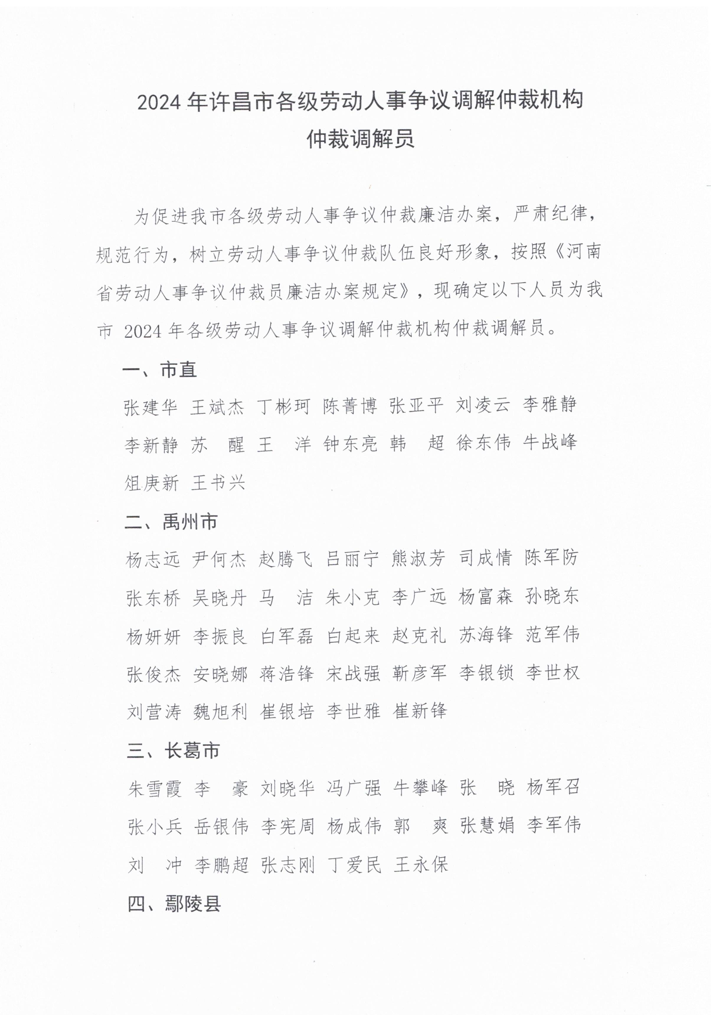 2024年许昌市各级劳动人事争议调解仲裁机构仲裁调解员