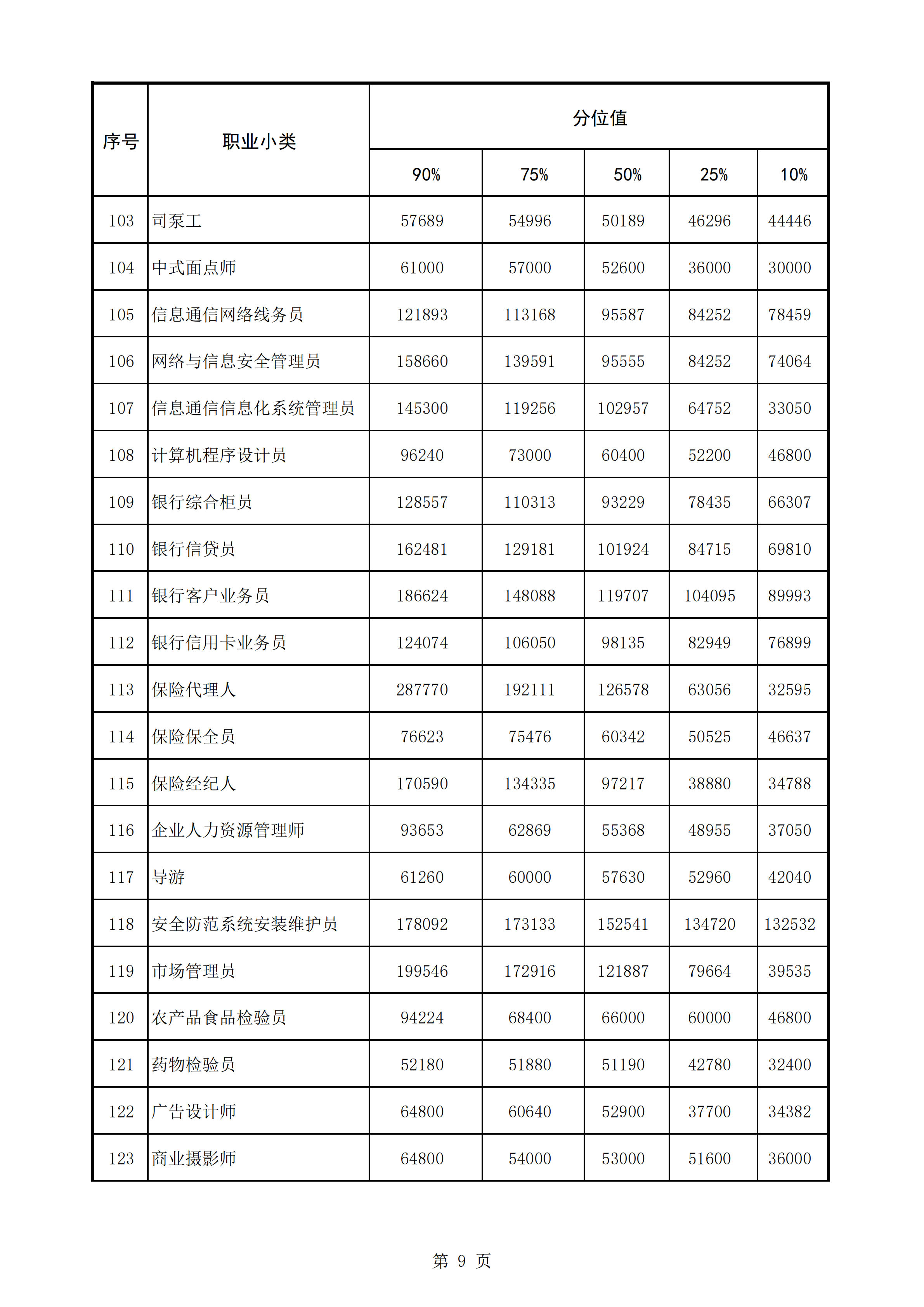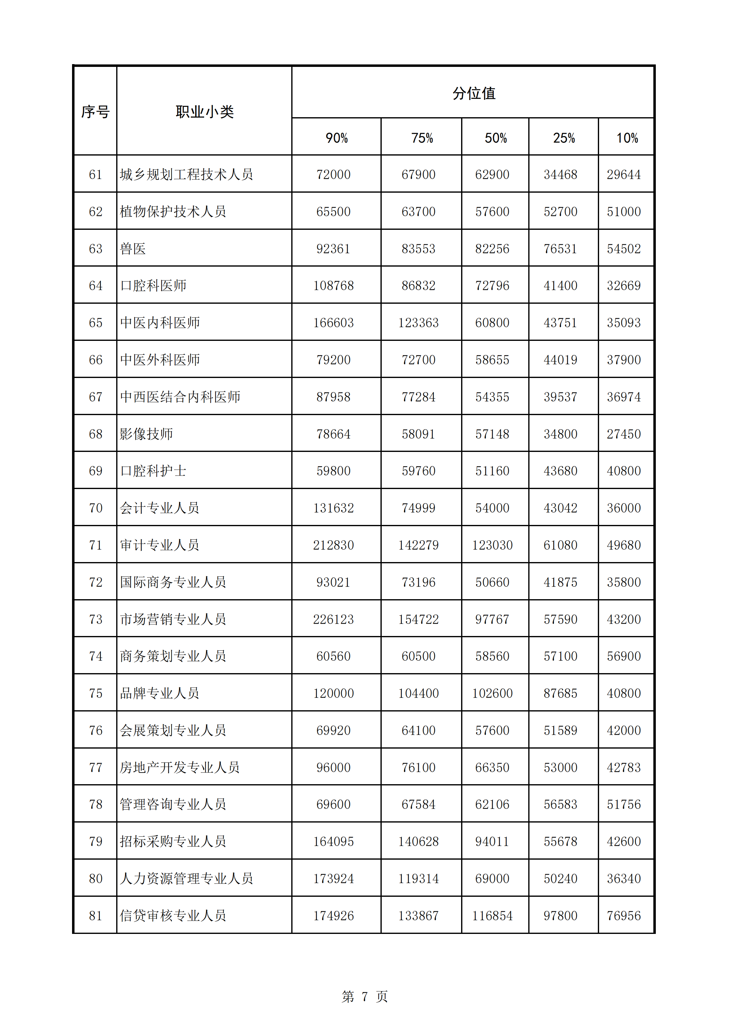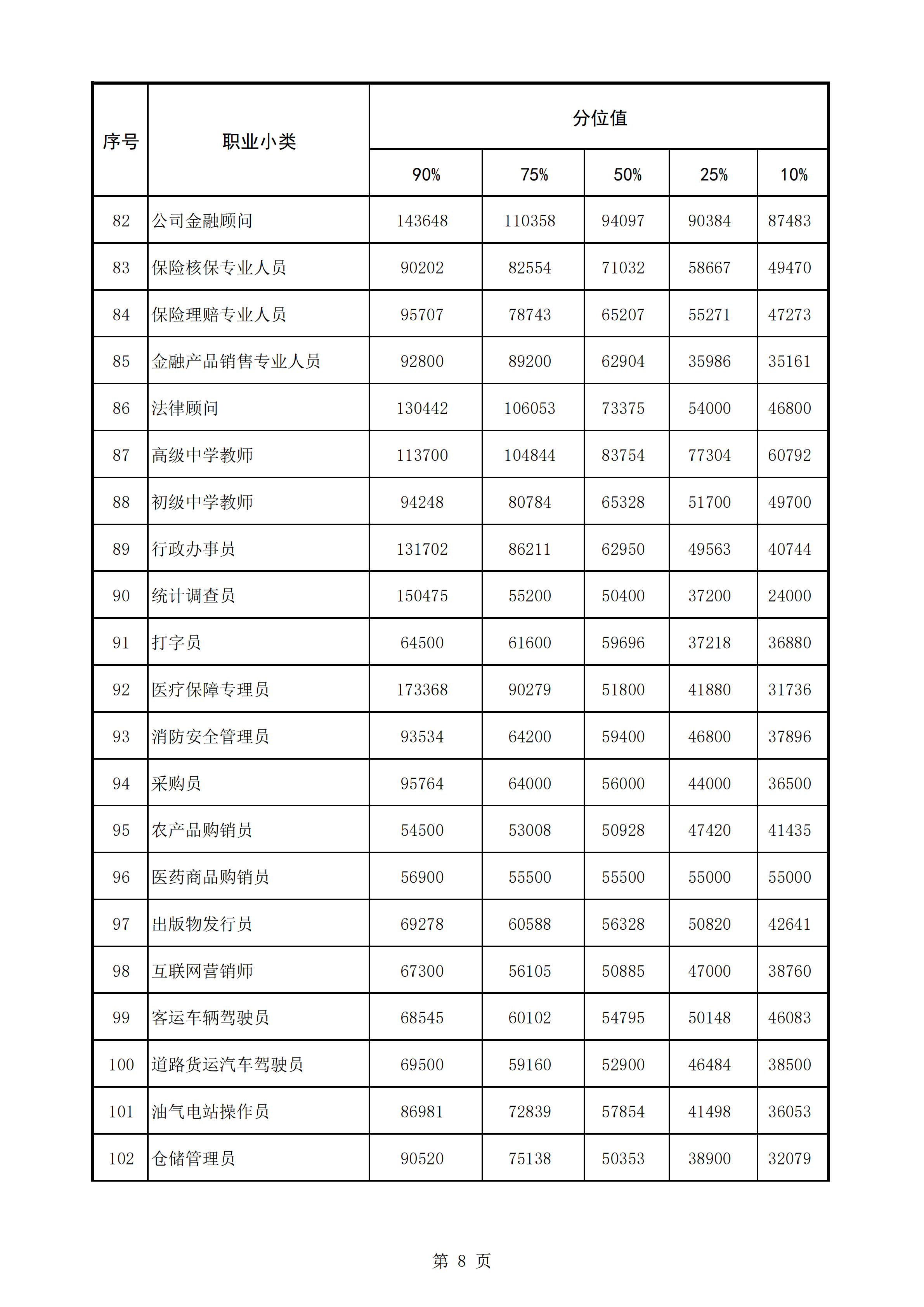 本次发布的从业人员工资报酬信息以年薪收入为主要形式,从工资水平上分90分位数、75分位数、50分位数、25分位数、10分位数五个档次。分位数是指某职业工资报酬从高到低排列,位于90%、75%、50%、25%、10%相应分割点区间数值的平均值,例如:全市有100人参与了某一职业的调查,把他们的年薪从高到低排序,排在第10名的就是高位数(90分位),即该位置年薪大于后面的90人;第25名的是上四分位数(75分位),即该位置年薪大于后面的75人;依次类推,第50名的是中位数(50分位),第75名的是下四分位数(25分位),第90名的是低位数(10分位)。其中,50分位数一般反映该工种薪酬的中位水平,但不等于其平均值。