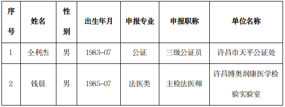 根据我市职称工作安排,通过个人申报、单位推荐、主管部门和许昌市人力资源社会保障部门资格审查、评委会承办部门复核,经河南省司法厅公共法律服务专业中级职称评审委员会专家评审,2名同志通过评审。现将评审通过人员公示,请予监督。如对公示人员有问题反映,请在公示期内以书面形式反馈我们。