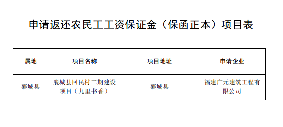 根据《河南省工程建设领域农民工工资保证金实施办法》(豫人社规〔2022〕4号),现对申请返还农民工工资保证金(保函正本)工程项目予以公示,如该项目涉及拖欠农民工工资问题,请于公示期内进行反馈,并提供有关证据材料。