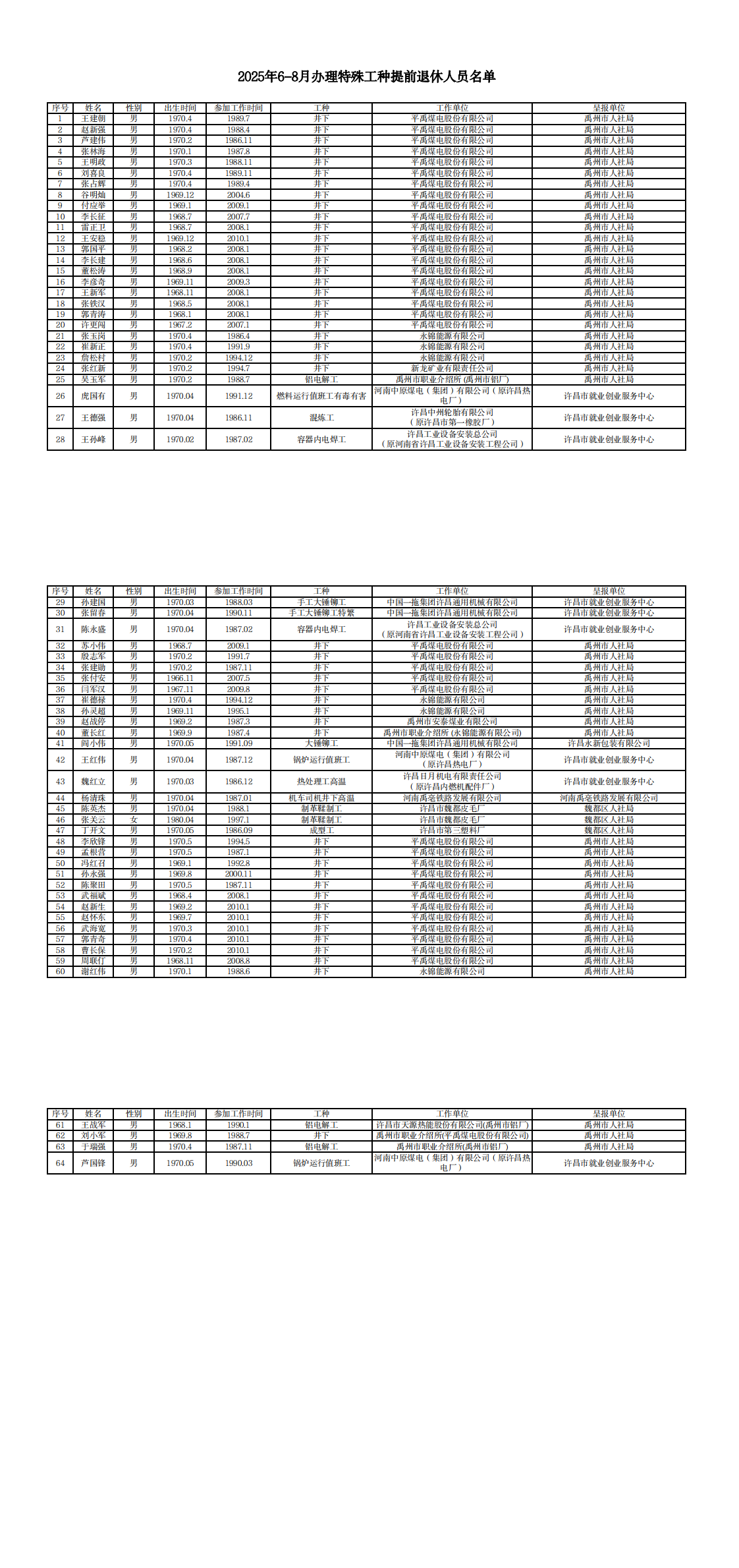 2025年6-8月办理特殊工种提前退休人员名单