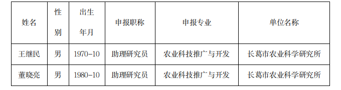 根据我市职称工作安排,通过个人申报、单位推荐、主管部门和许昌市人力资源社会保障部门资格审查、评委会承办部门复核,经漯河市农业科学研究系列中级职称评审委员会组织专家评审,2名同志通过评审。现将评审通过人员公示如下,请予监督。如对公示人员有问题反映,请在公示期内以书面形式反馈我们。