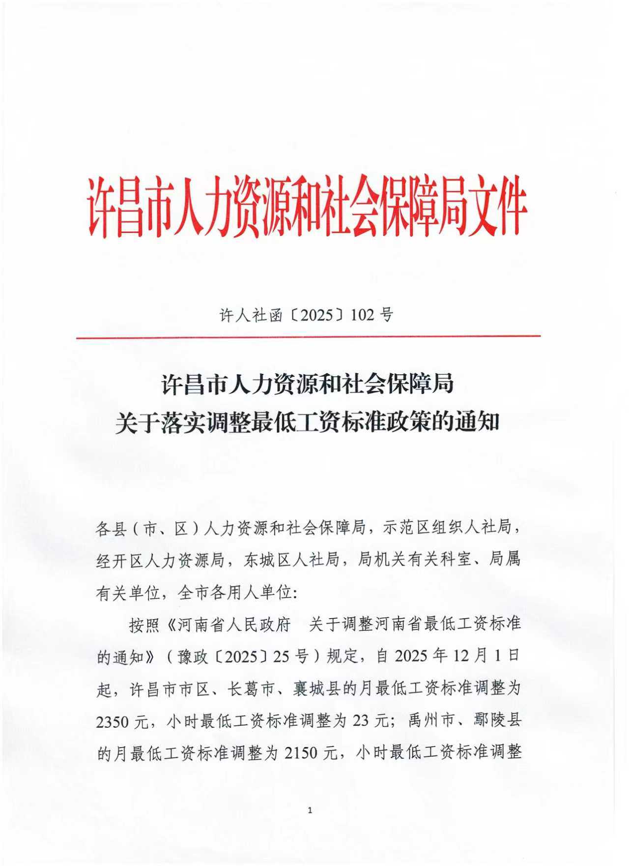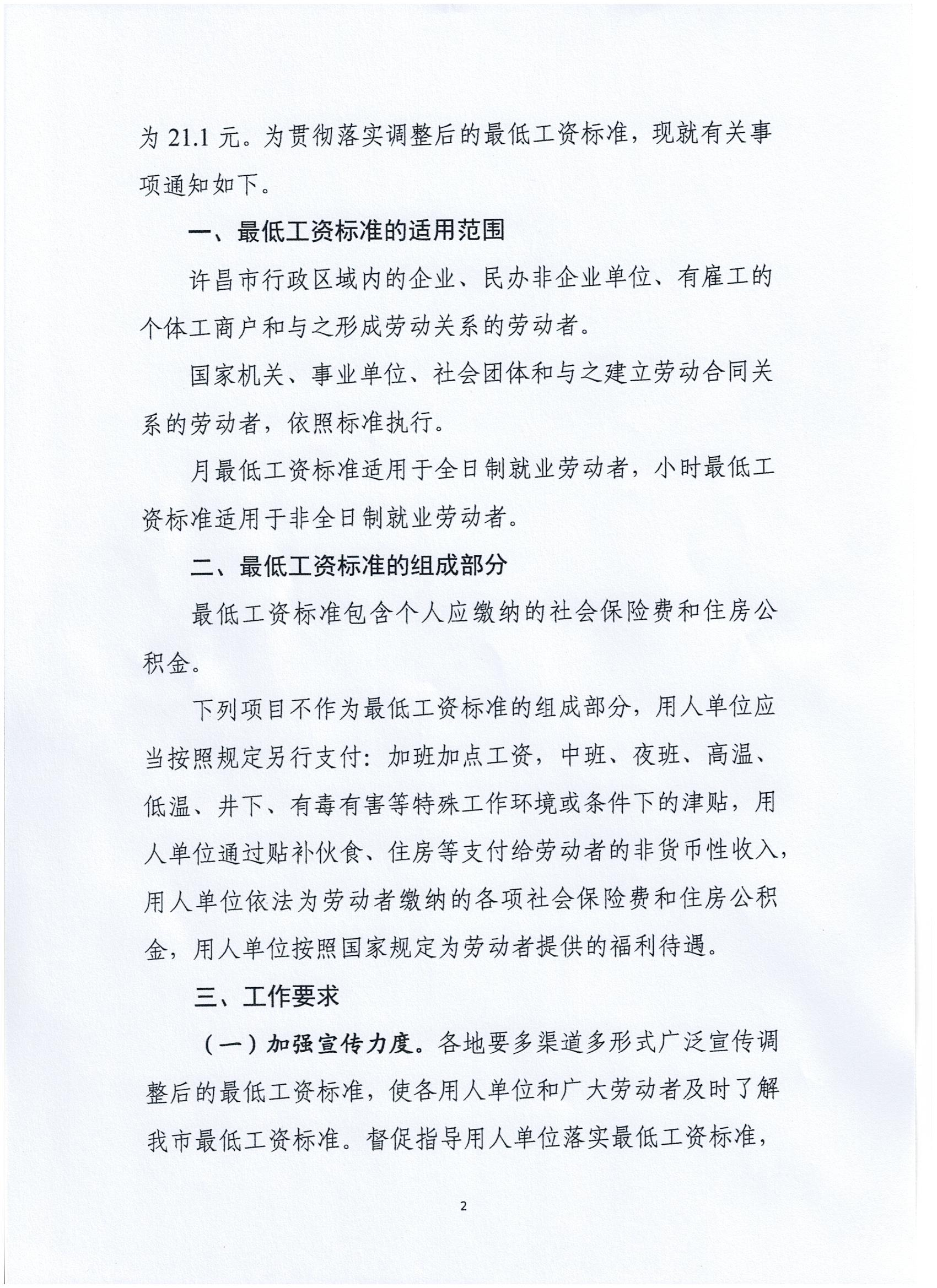 许昌市人力资源和社会保障局关于落实调整最低工资标准政策的通知