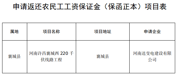 根据《河南省工程建设领域农民工工资保证金实施办法》(豫人社规〔2022〕4号),现对申请返还农民工工资保证金(保函正本)工程项目予以公示,如该项目涉及拖欠农民工工资问题,请于公示期内进行反馈,并提供有关证据材料。