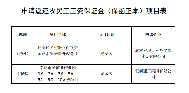 根据《河南省工程建设领域农民工工资保证金实施办法》(豫人社规〔2022〕4号),现对申请返还农民工工资保证金(保函正本)工程项目予以公示,如该项目涉及拖欠农民工工资问题,请于公示期内进行反馈,并提供有关证据材料。