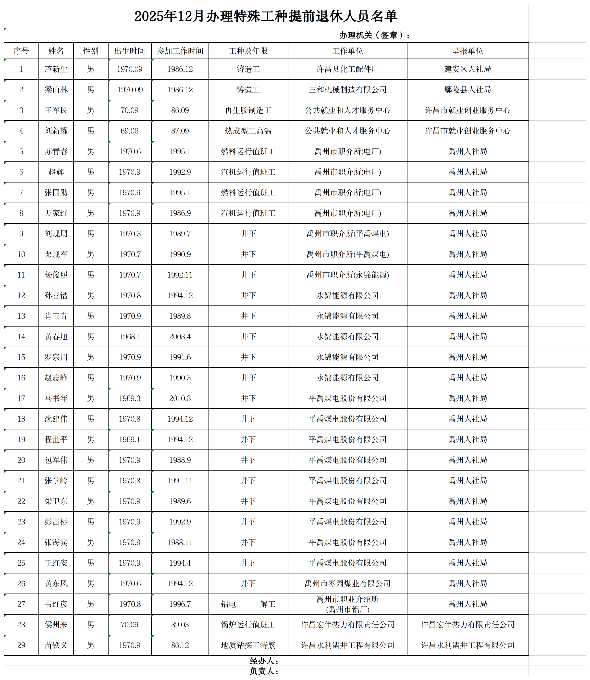 许昌市2025年12月办理特殊工种提前退休人员名单